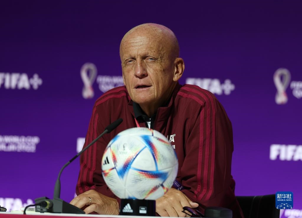 11月18日,國際足聯(lián)裁判委員會(huì)主席皮耶路易吉·科利納在通氣會(huì)上。新華社記者 賈浩成 攝