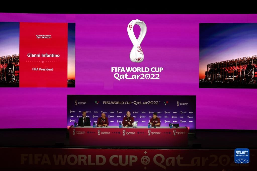 11月18日,國際足聯(lián)主席因凡蒂諾(右二)在通氣會(huì)上發(fā)言。新華社記者 賈浩成 攝