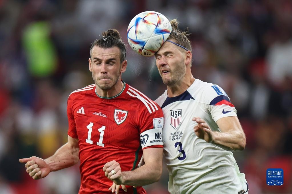 11月21日,威爾士隊(duì)球員加雷斯·貝爾(左)在比賽中與美國隊(duì)球員齊默曼爭頂頭球。