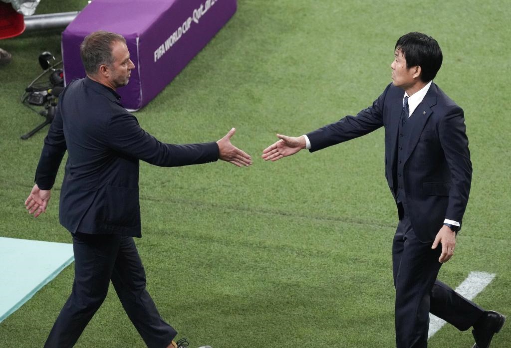 11月23日,德國隊(duì)主教練弗利克(左)與日本隊(duì)主教練森保一在賽后握手。新華社記者陳誠攝