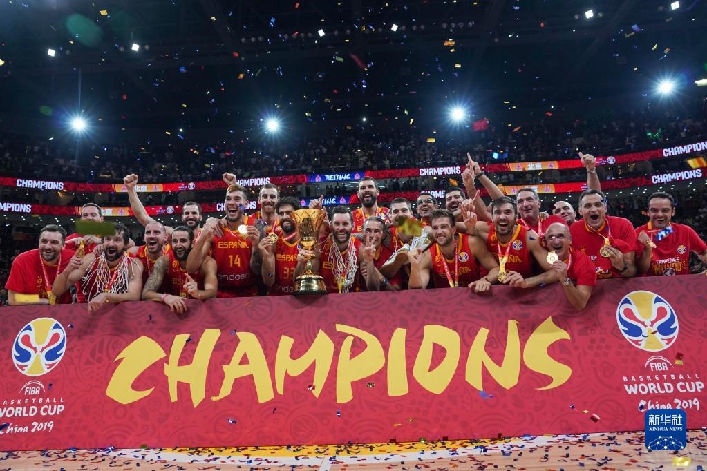 這是2019年9月15日,西班牙隊在國際籃聯(lián)籃球世界杯奪冠后慶祝。新華社記者 鞠煥宗 攝