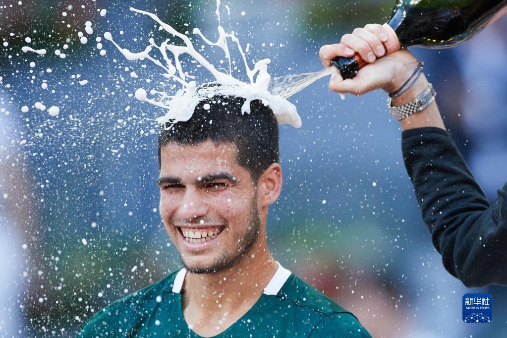 這是2022年5月8日,阿爾卡拉斯在馬德里網(wǎng)球公開賽男子單打頒獎儀式上慶祝。新華社記者 孟鼎博 攝