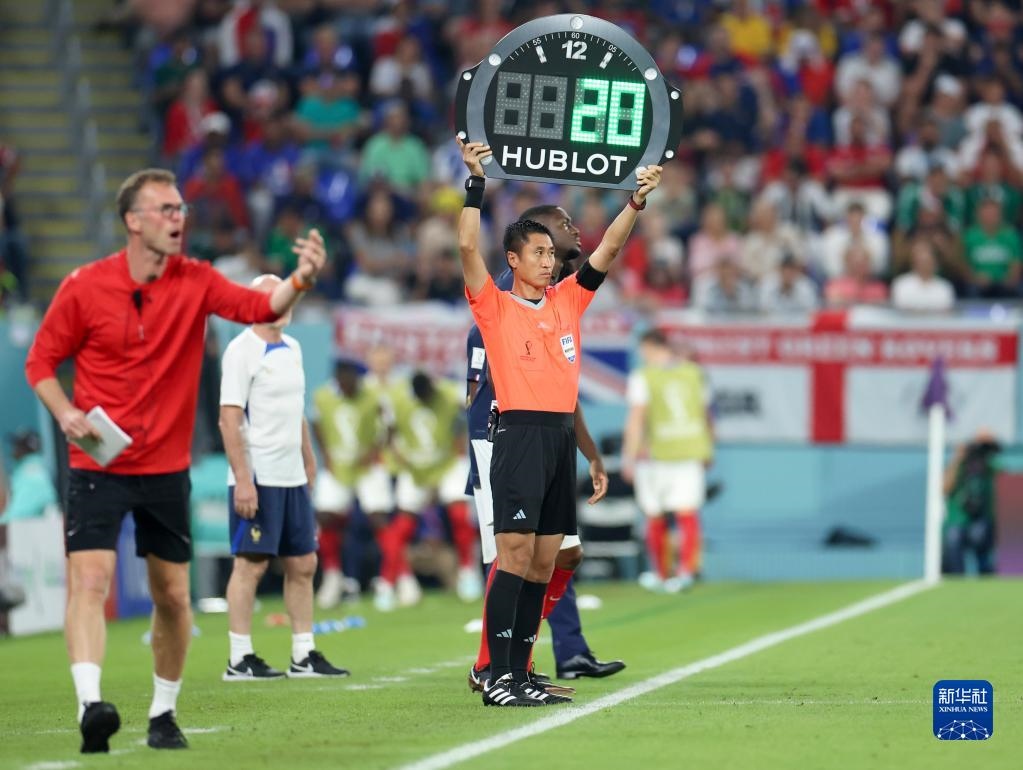 2022年11月26日,第四官員馬寧(右)在卡塔爾世界杯法國隊(duì)對丹麥隊(duì)的比賽中舉起換人牌。新華社記者 李明 攝