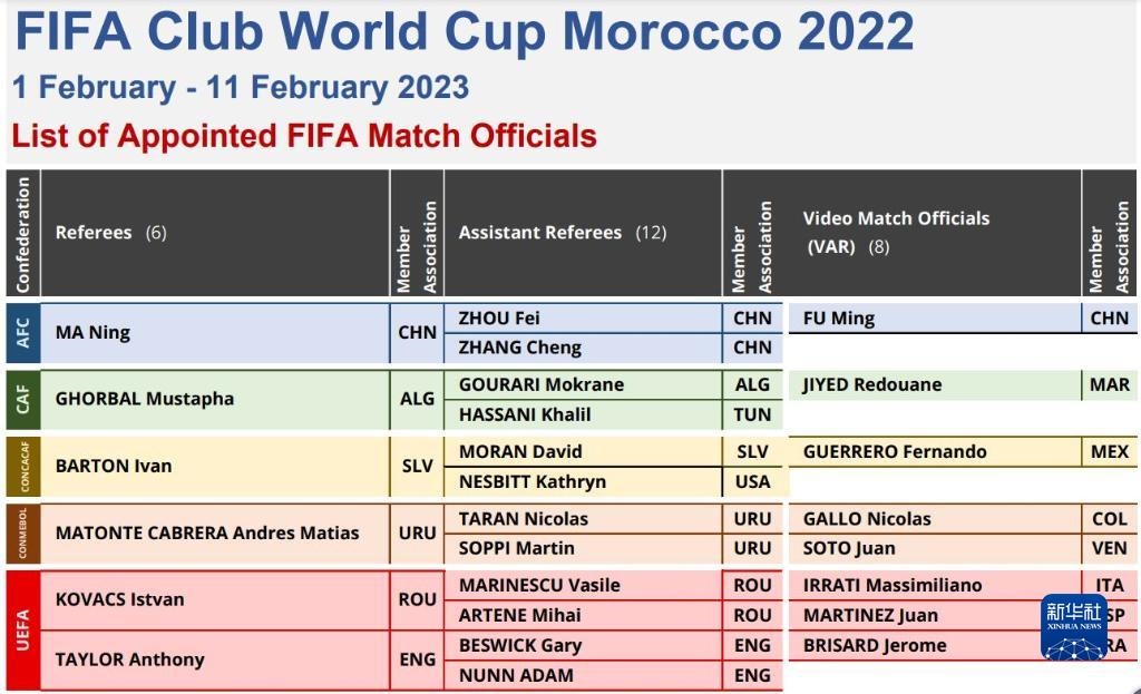新華社北京1月15日電 國際足聯(lián)15日在官網(wǎng)公布2022摩洛哥世俱杯執(zhí)法裁判員名單,國際級裁判員馬寧、傅明和國際級助理裁判員周飛、張鋮入選。這將是中國裁判員首次執(zhí)法該項(xiàng)國際足聯(lián)頂級賽事。
