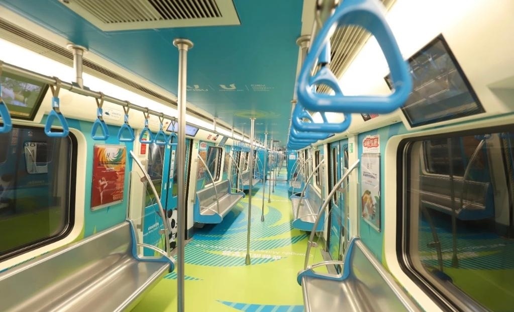 整體車廂打造創(chuàng)新植入了色彩明快、充滿青春氣息的“移動(dòng)運(yùn)動(dòng)場”概念,立面畫面則結(jié)合青春動(dòng)感的大學(xué)生形象,并選用田徑、網(wǎng)球、籃球、體操等運(yùn)動(dòng)的代表性動(dòng)作為設(shè)計(jì)元素,全面凸顯成都大運(yùn)會賽事核心主題。