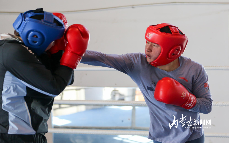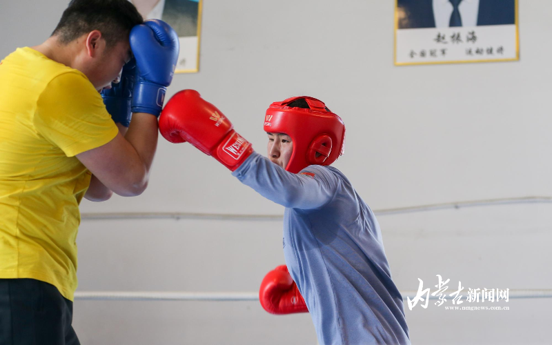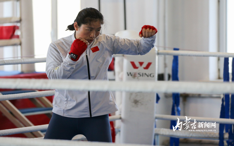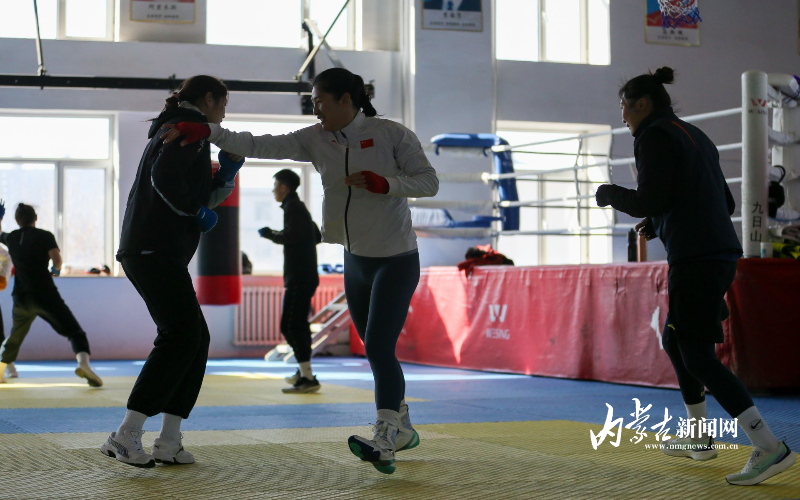 當日,記者在拳擊館內(nèi)看到,在訓(xùn)練中李倩腳步輕盈,汗珠在額頭滑落。她戴上拳套,走向沙袋,一記記重拳砸出,發(fā)出沉悶的“砰”聲。內(nèi)蒙古女子拳擊隊的數(shù)十名拳手正在同時訓(xùn)練,沙袋晃動,呼吸急促,空氣中彌漫著汗水與堅持的味道?!胺朗?,腳下要穩(wěn)!”內(nèi)蒙古拳擊隊總教練哈達巴特爾的聲音在空間回蕩。李倩的訓(xùn)練格外嚴格。除了常規(guī)力量訓(xùn)練、反應(yīng)訓(xùn)練和體能循環(huán),她還要進行一對一的與男拳手的實戰(zhàn)模擬,幾次交鋒下來,氣息都愈發(fā)急促。但李倩沒有退縮,反而越打越穩(wěn),腳步靈活,出拳干凈利落。