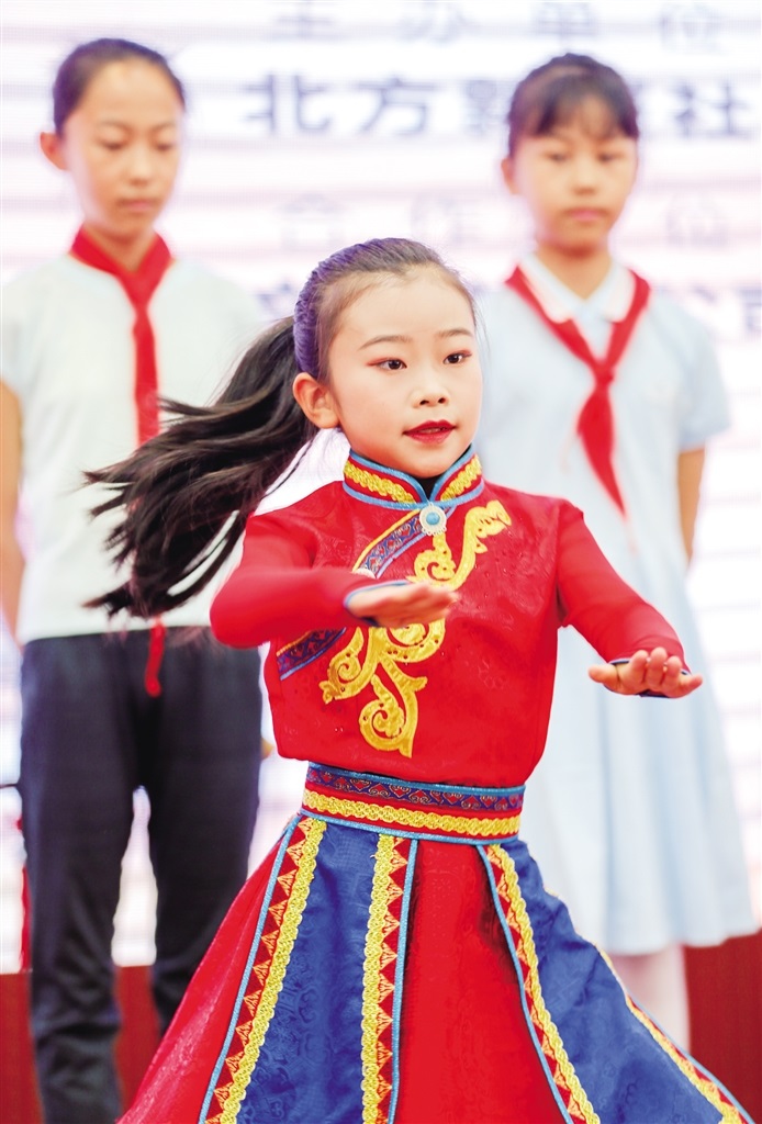 同樣來自騰飛路小學(xué)三年級(jí)5班的寧悅彤壓軸出場(chǎng),在舞臺(tái)上激情四射的啦啦操表演獲得了很高的分?jǐn)?shù)。就在前一天,她和她的小伙伴們代表學(xué)校參加呼和浩特市第六屆中小學(xué)啦啦操健美操大賽,捧回了團(tuán)體第一的驕人成績(jī)。寧悅彤在后臺(tái)接受記者采訪時(shí)說:“第一次站上這樣大的舞臺(tái)表演,起初有點(diǎn)緊張,有幾個(gè)動(dòng)作在表演過程中需要身體接觸地面,會(huì)很疼,但這是必須要承受的。我覺得這次經(jīng)歷也讓我更加勇敢,更加自信了。”