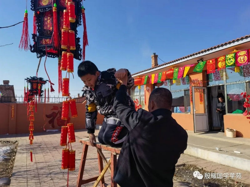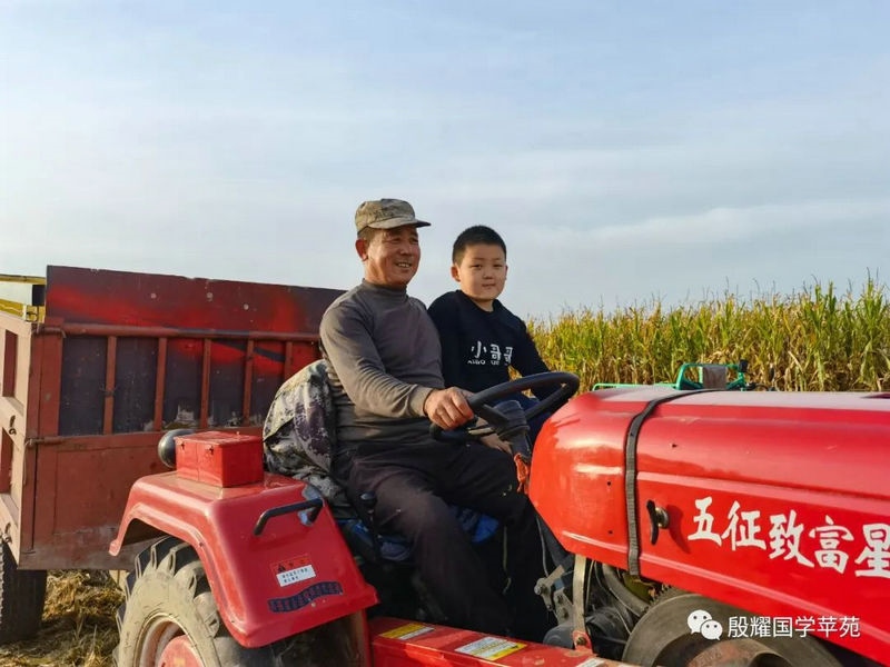 父親讓曈曈接地氣的愿望實現(xiàn)了,長得越來越壯實的曈曈真是打心眼喜歡上了農(nóng)村,喜歡看叔叔大爺們是如何勞動的。春天澆地的時候,他跟上我的發(fā)小利利到地里去,手里拿上一張鐵鍬學(xué)著去攏堰堤;秋收的時候他爬上了丁補元駕駛的收割機,感受農(nóng)民們收割玉米的喜悅;接羔的時候,他又鉆進(jìn)利軍家的羊群里,抱著出生沒有幾天的小羊羔,給小羊羔喂牛奶……春節(jié)前的一兩天是他最忙的時候:一會跟上大爹貼春聯(lián),一會跟上茹義大爺掛紅燈,忙得不亦樂乎。前一段時間回村里他又要跟上利軍大爺出村放羊去,又要跟上茹義大爺去種玉米,在城里他是見識不到這些的。