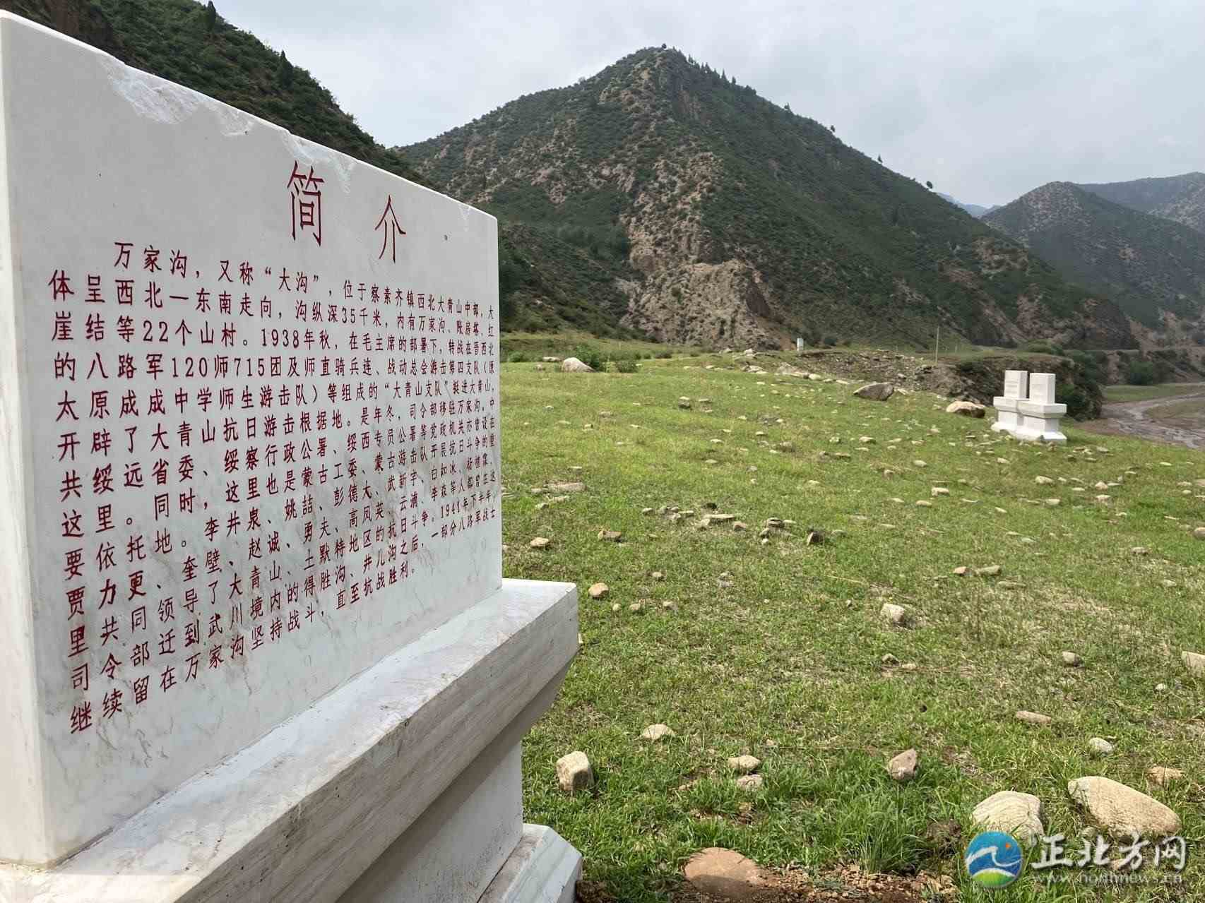 入溝不久,在綠草如茵的山坡上,就可以眺望到遠(yuǎn)處已經(jīng)廢棄的民房,有幾十年前的老房子,也有建筑時(shí)間不長(zhǎng)的,眼前的一切讓人恍惚,仿佛剛剛還在上演煙火氣息的鄉(xiāng)村生活。在這里矗立著寫(xiě)有“萬(wàn)家溝革命遺址”的漢白玉紀(jì)念碑,這是土左旗文物保護(hù)中心副主任高鷹和同事們半年前安放的。從這里,萬(wàn)家溝革命遺址的探訪正式開(kāi)始。