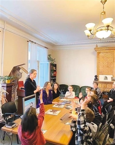 俄羅斯小讀者隔屏向中國(guó)作家黑鶴提問(wèn)。