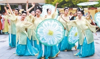 中國(guó)絲綢博物館舉辦“國(guó)絲漢服節(jié)”快閃活動(dòng)。