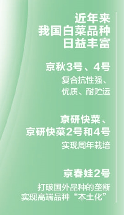 近年來,我國白菜育種實力突飛猛進,品種日益豐富,實現(xiàn)了從單一“秋播冬貯”向優(yōu)勢產(chǎn)區(qū)生產(chǎn)、產(chǎn)品多樣化和周年生產(chǎn)轉(zhuǎn)變。培育出了復(fù)合抗性強、優(yōu)質(zhì)、耐貯運的品種“京秋3號、4號”等,高品質(zhì)、速生苗用品種“京研快菜、京研快菜2號和4號”3個品種搭配實現(xiàn)了周年栽培,解決了生產(chǎn)上長期缺乏冬春和夏季栽培專用品種的難題。還育成了娃娃菜、快菜、紹菜、金絲白等高品質(zhì)品種,尤其是“京春娃2號”一舉打破國外品種的壟斷,它比國外品種早熟5至7天,種植密度高25%,畝收入增長30%,已成為國產(chǎn)娃娃菜第一大品種,實現(xiàn)了高端品種的“本土化”。