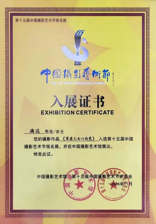 近日,內(nèi)蒙古畫報社記者滿達攝影作品《草原兒女心向黨》入選第十五屆中國攝影藝術節(jié)報名展。
