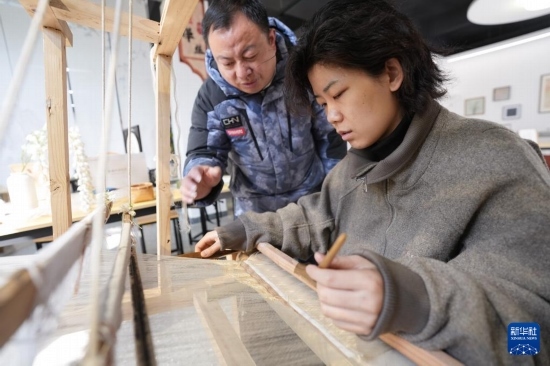 2月19日,柯翔祥(左)在德清莫干山鎮(zhèn)由蠶種場(chǎng)改造的絲綢技藝展示館給從西安前來研學(xué)的大學(xué)生介紹緙絲技術(shù)。