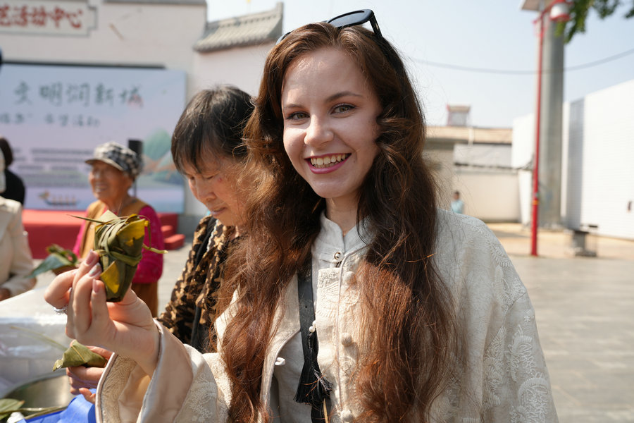 活動現(xiàn)場,粽香四溢,歡聲笑語此起彼伏。大家圍在一起,捋粽葉、填糯米、扎絲線,共同體驗包粽子的傳統(tǒng)習(xí)俗。手法嫻熟的村民手把手教授外國友人包粽子的技巧,不一會兒,一個個形態(tài)各異的粽子便擺滿了桌。來自烏克蘭的留學(xué)生安吉麗娜學(xué)得格外認(rèn)真,她一邊模仿著村民的動作,一邊忍不住贊嘆:“喜歡包粽子,粽子好吃!”言語間滿是對中國傳統(tǒng)美食的喜愛。