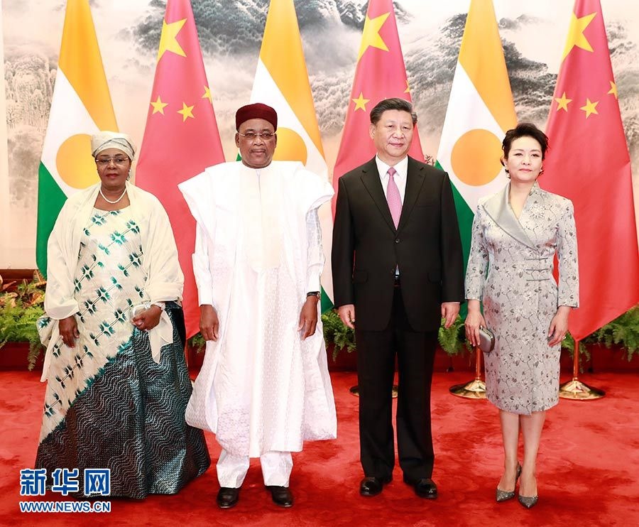 5月28日,國家主席習(xí)近平在北京人民大會堂同尼日爾總統(tǒng)伊素福舉行會談。這是習(xí)近平和夫人彭麗媛同伊素福夫婦合影。