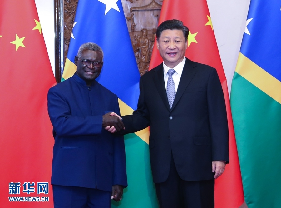 10月9日,國家主席習(xí)近平在北京釣魚臺國賓館會見所羅門群島總理索加瓦雷。