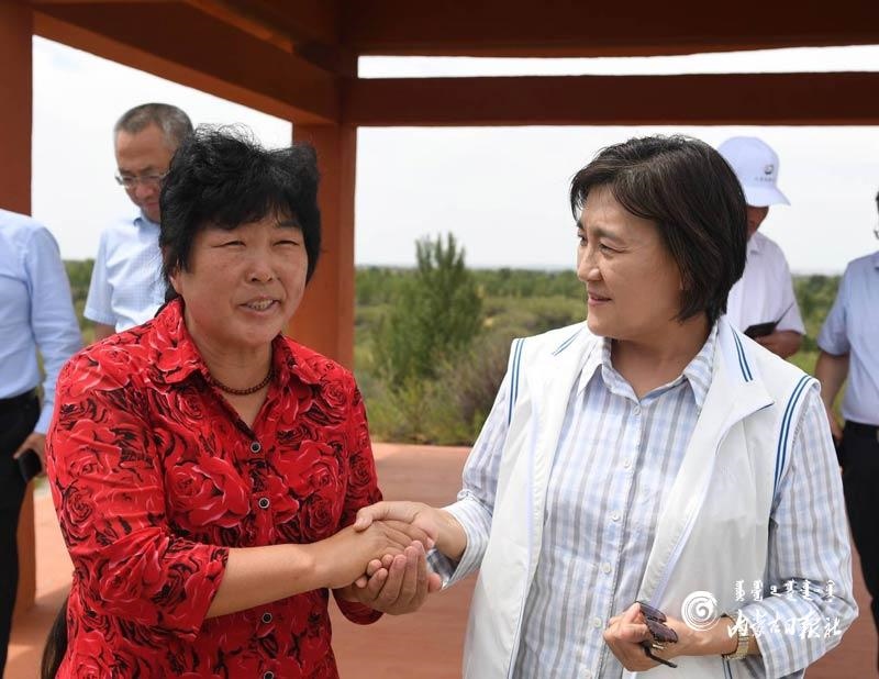 烏蘭陶勒蓋治沙站位于烏審旗毛烏素沙地腹部,建站40多年來(lái),以治沙造林、保護(hù)森林資源為己任,一代接著一代干,防沙治沙工作取得了明顯成效。布小林來(lái)到烏蘭陶勒蓋治沙站,調(diào)研治沙造林工作,并與全國(guó)“三八·綠色獎(jiǎng)?wù)隆鲍@得者殷玉珍親切交流,對(duì)當(dāng)?shù)厣鷳B(tài)治理的模式和成效給予肯定。她還來(lái)到伊金霍洛旗紅慶河鎮(zhèn),考察鄉(xiāng)村治理、消費(fèi)扶貧等工作。