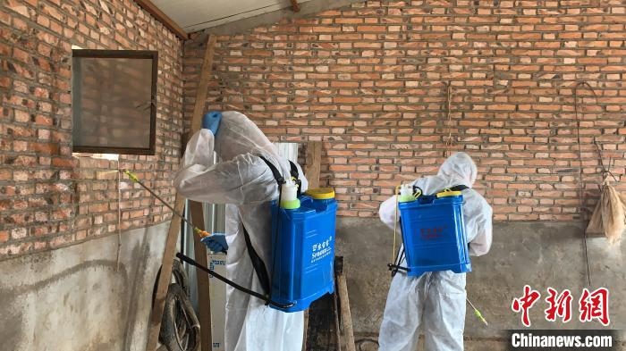 圖為呼斯楞正在跟同事一起為賽因烏力吉家棚圈消毒?!W藍(lán) 攝