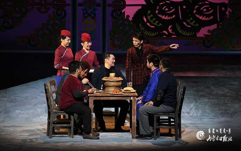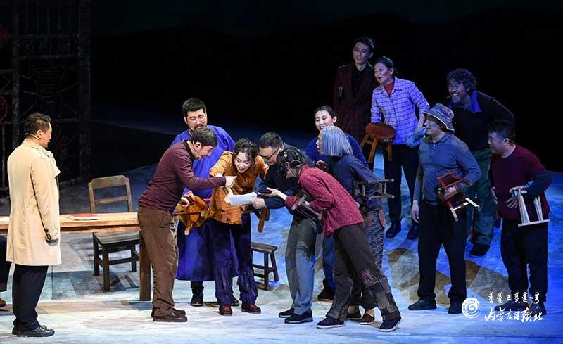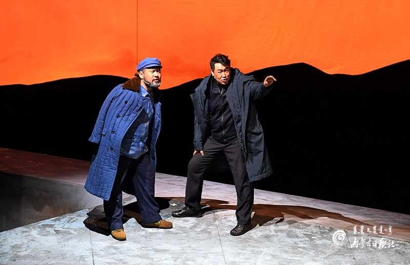 參演《紅手印》的都是來(lái)自草原的蒙古族演員,不僅要完成漢語(yǔ)的臺(tái)詞,還要熟練自然地講出大量?jī)?nèi)蒙古西部方言對(duì)白?!皩?duì)于話劇演員來(lái)說(shuō),臺(tái)詞功底太重要了。為了練好方言,我們好多演員早起練功的時(shí)候嘴里都念念有詞地說(shuō)著西部方言?!毖輪T烏仁朝魯門說(shuō)。他扮演的新扎木村主任令人印象深刻,一個(gè)一心想帶百姓致富卻屢遭失敗的老黨員形象?!爸氨硌輾v史題材的話劇大多是從影像和資料了解人物,這部戲的題材貼近觀眾們的現(xiàn)實(shí)生活,必須接地氣才能得到認(rèn)可。我通過(guò)寫(xiě)人物小傳的方式,深挖村主任的人物個(gè)性和從失望到燃起希望的內(nèi)心世界,讓觀眾能夠認(rèn)可這個(gè)形象。”烏仁朝魯門說(shuō)。