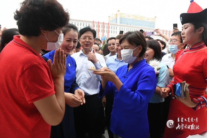 布小林認真觀看精品旅游線路和重點景區(qū)、民族手工藝品、特色文創(chuàng)旅游商品、非物質(zhì)文化遺產(chǎn)、傳統(tǒng)技藝制作以及傳統(tǒng)蒙古包展示,了解文旅科技發(fā)展,并與相關(guān)人員交流商品的創(chuàng)意設(shè)計、制作工藝、市場銷售等情況,鼓勵他們保護傳承好民族手工藝、非物質(zhì)文化遺產(chǎn)和傳統(tǒng)技藝,注重將傳統(tǒng)工藝與現(xiàn)代技藝結(jié)合起來,與現(xiàn)實生活和時尚需求結(jié)合起來,使其具有更旺盛的生命力和更廣闊的市場。在內(nèi)蒙古味道展示區(qū),布小林仔細詢問特色美食的制作和食材來源,并向現(xiàn)場群眾介紹內(nèi)蒙古農(nóng)畜產(chǎn)品。她說:“內(nèi)蒙古的農(nóng)畜產(chǎn)品是有機、綠色的,大家可以放心吃?!?/p>