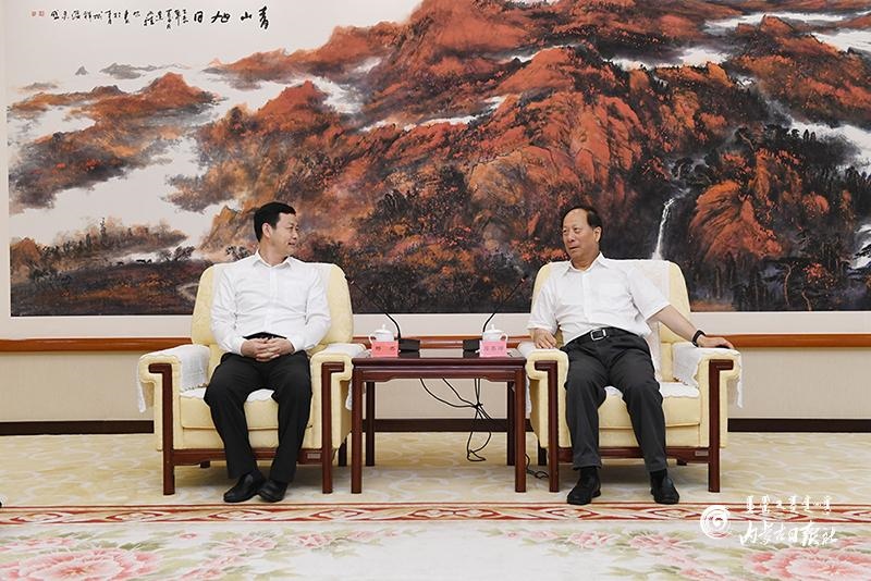 8月27日下午,自治區(qū)黨委書記、人大常委會(huì)主任石泰峰在呼和浩特會(huì)見中國(guó)移動(dòng)通信集團(tuán)有限公司董事長(zhǎng)楊杰。內(nèi)蒙古日?qǐng)?bào)社融媒體記者 袁永紅 攝