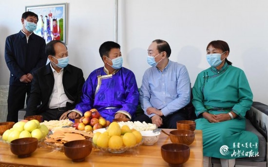 8月29日,中共中央政治局委員、中宣部部長黃坤明在內蒙古自治區(qū)黨委書記、人大常委會主任石泰峰陪同下,深入興安盟科右中旗巴彥茫哈蘇木哈圖布其嘎查,走進牧戶家中了解生產生活和脫貧情況。內蒙古日報記者袁永紅攝