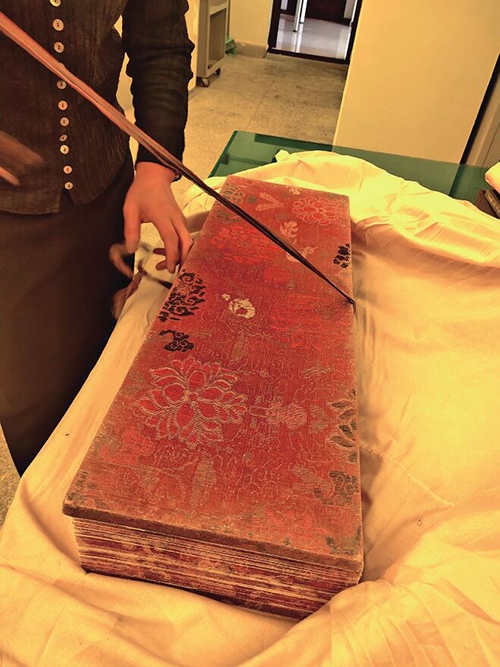 古籍庫管理員趙峰琴老師為我們打開了一部金字《甘珠爾》,這部經(jīng)書被很多層“衣服”包裹著,還保留著最初的樣貌。300多頁的經(jīng)書精美華麗,文字清晰,側面帶有佛像,珍貴無比,令人贊嘆。