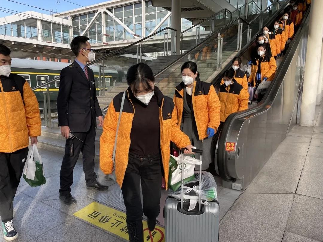 15時(shí),車站工作人員引導(dǎo)醫(yī)務(wù)人員快速通過專用通道,開始登車。