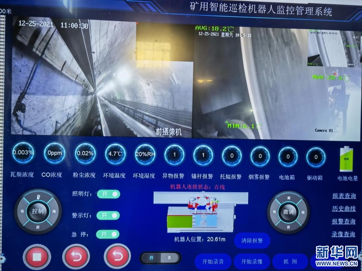 25日,在鄂爾多斯市麻地梁煤礦的輸煤傳送帶上,一臺(tái)礦用AI(人工智能機(jī)器人)“打工人”身著藍(lán)色“工衣”,行進(jìn)在運(yùn)輸皮帶上,它依靠一雙10CM大的“眼睛”,敏銳觀察著皮帶上源源不斷傳送的煤炭,并檢查異物。它身上安裝了高精度傳感器,可以實(shí)時(shí)將瓦斯、二氧化碳、粉塵濃度傳回麻地梁煤礦智能調(diào)度集控中心。