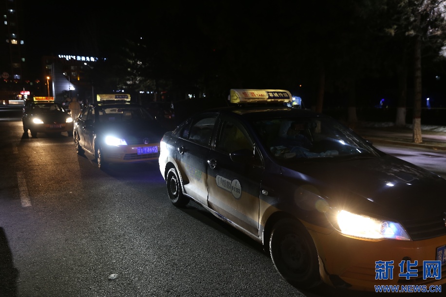 2月20日晚9點,前往指定地點運送樣本的出租車排起了長隊,完成這一次運送,司機們當(dāng)天的任務(wù)就完成了。新華網(wǎng)發(fā) 李倩攝