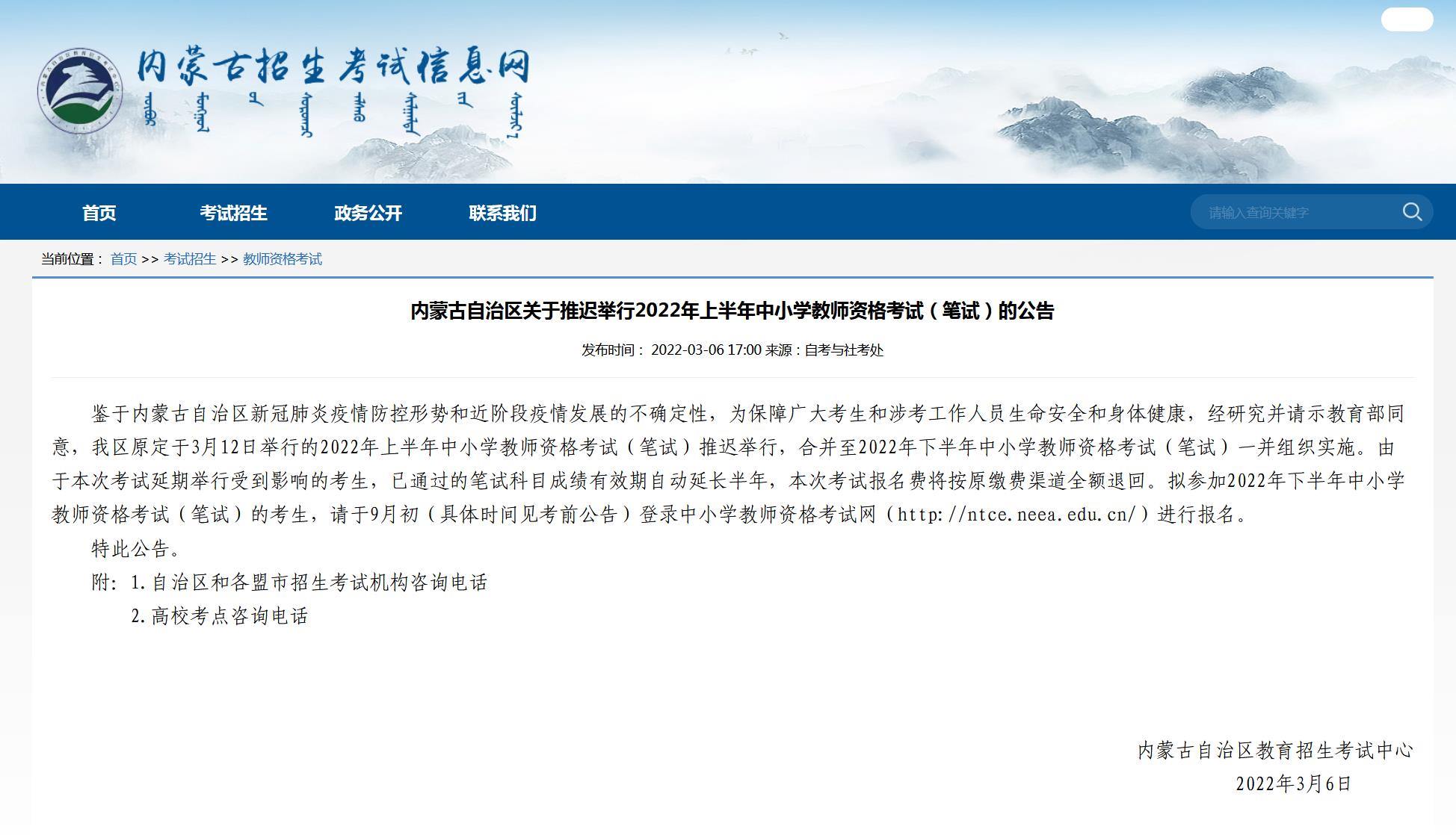 據(jù)內(nèi)蒙古招生考試信息網(wǎng)消息,3月6日,內(nèi)蒙古自治區(qū)教育招生考試中心發(fā)布公告稱(chēng),鑒于內(nèi)蒙古自治區(qū)新冠肺炎疫情防控形勢(shì)和近階段疫情發(fā)展的不確定性,為保障廣大考生和涉考工作人員生命安全和身體健康,經(jīng)研究并請(qǐng)示教育部同意,原定于3月12日舉行的2022年上半年中小學(xué)教師資格考試(筆試)推遲舉行,合并至2022年下半年中小學(xué)教師資格考試(筆試)一并組織實(shí)施。由于本次考試延期舉行受到影響的考生,已通過(guò)的筆試科目成績(jī)有效期自動(dòng)延長(zhǎng)半年,本次考試報(bào)名費(fèi)將按原繳費(fèi)渠道全額退回。