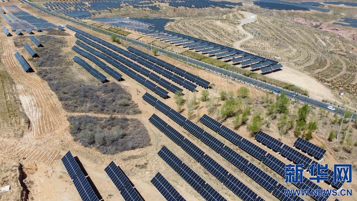 這是4月12日拍攝的內(nèi)蒙古鄂爾多斯市布爾臺(tái)沉陷區(qū)上的光伏板。(無(wú)人機(jī)照片)新華社記者 貝赫 攝