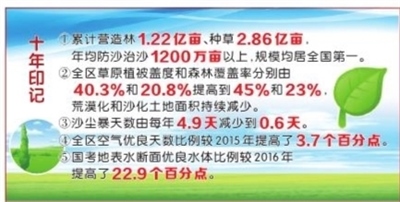 累計(jì)營(yíng)造林1.22億畝、種草2.86億畝,年均防沙治沙1200萬(wàn)畝以上,規(guī)模均居全國(guó)第一;全區(qū)草原植被蓋度和森林覆蓋率分別由40.3%和20.8%提高到45%和23%,荒漠化和沙化土地面積持續(xù)減少;全區(qū)空氣優(yōu)良天數(shù)比例較2015年提高3.7個(gè)百分點(diǎn),國(guó)考地表水?dāng)嗝鎯?yōu)良水體比例較2016年提高22.9個(gè)百分點(diǎn)……