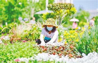 7月13日,工作人員在呼和浩特市草原絲綢之路文化公園維護、修整花境。據(jù)了解,呼和浩特市園林建設服務中心2022年在全市范圍內(nèi)打造19個花境,目前已全部建設完成。不同花境采取不同主題,景色錯落有致,讓市民們走出家門就可欣賞唯美詩意的生態(tài)花境。(內(nèi)蒙古日報社融媒體記者 王磊攝)