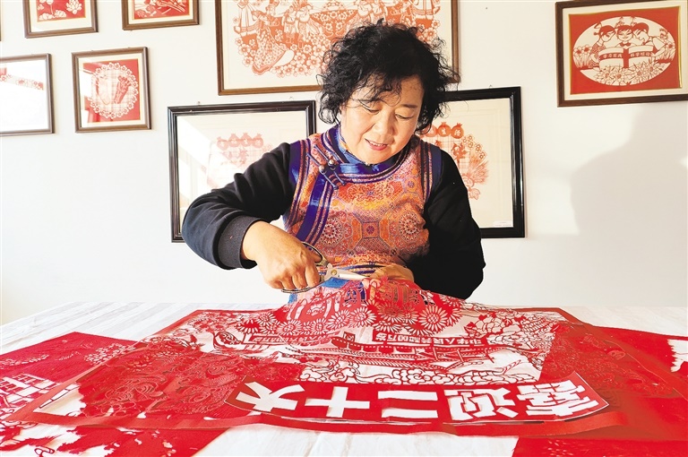 10月15日下午,自治區(qū)非遺剪紙項目傳承人、呼和浩特市土默特左旗畢克齊鎮(zhèn)紅秀剪紙合作社發(fā)起人李還秀在創(chuàng)作慶祝黨的二十大勝利召開系列剪紙作品。連日來,全區(qū)各地群眾通過剪紙、書法等藝術(shù)形式,表達對盛會的期盼、對祖國的祝福。記者 鄭學(xué)良 實習(xí)生 郭亞麗 攝