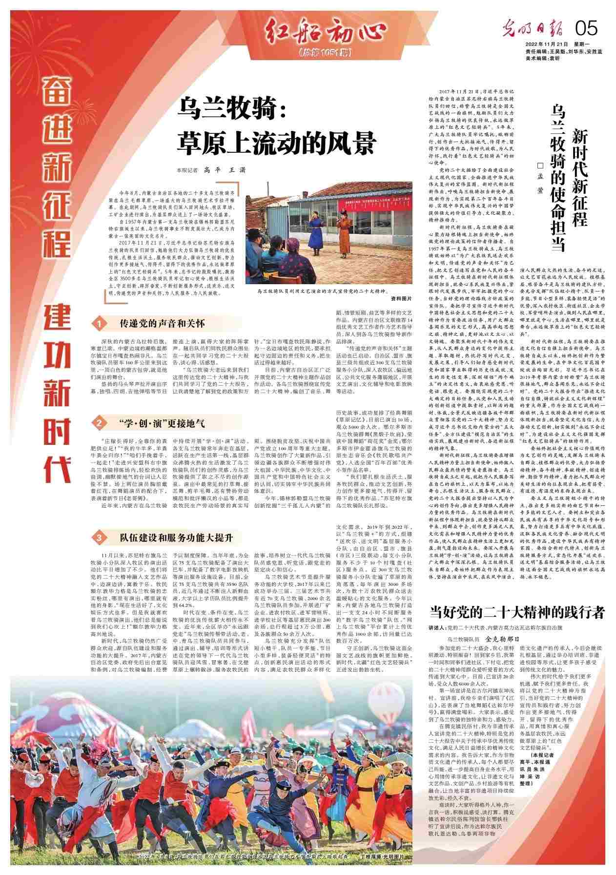 目前,內(nèi)蒙古自治區(qū)正廣泛開展黨的二十大精神主題作品創(chuàng)作活動(dòng)。各烏蘭牧騎圍繞宣傳黨的二十大精神,編創(chuàng)了音樂、舞蹈、情景短劇、曲藝等多樣的文藝作品。內(nèi)蒙古自治區(qū)文聯(lián)推薦14組優(yōu)秀文藝工作者作為藝術(shù)指導(dǎo)員,深入到各烏蘭牧騎指導(dǎo)新作品排演。