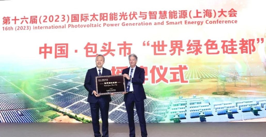 5月23日,第十六屆(2023)國(guó)際太陽(yáng)能光伏與智慧能源(上海)大會(huì)召開。大會(huì)開幕式上,全球綠色能源理事會(huì)授予包頭市“世界綠色硅都”稱號(hào)。澳大利亞新南威爾士大學(xué)教授、超高效光電學(xué)研究中心兼任執(zhí)行研究主任、澳大利亞科學(xué)院院士馬丁·格林代表全球綠色能源理事會(huì)向包頭市授牌。自治區(qū)黨委常委、市委書記丁繡峰致辭并推介“世界綠色硅都”。市委副書記、市長(zhǎng)張銳代表包頭市接牌。
