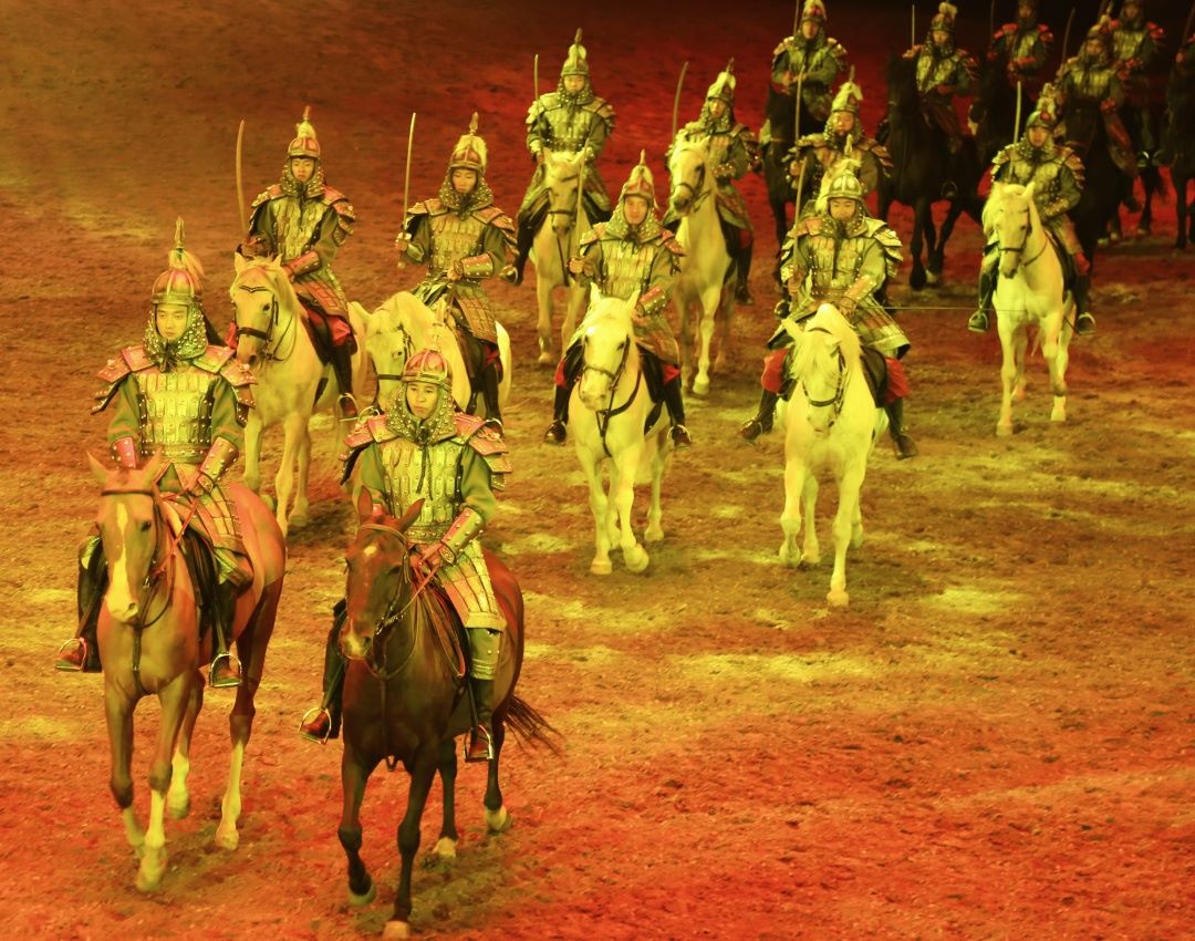 蒙古馬、汗血寶馬、盧西塔諾、弗里斯蘭、安達(dá)盧西亞、德保矮馬、阿拉伯馬等百余匹名馬、百名騎手組成龐大陣容的表演,整場演出恢宏震撼,充滿視覺沖擊力。
