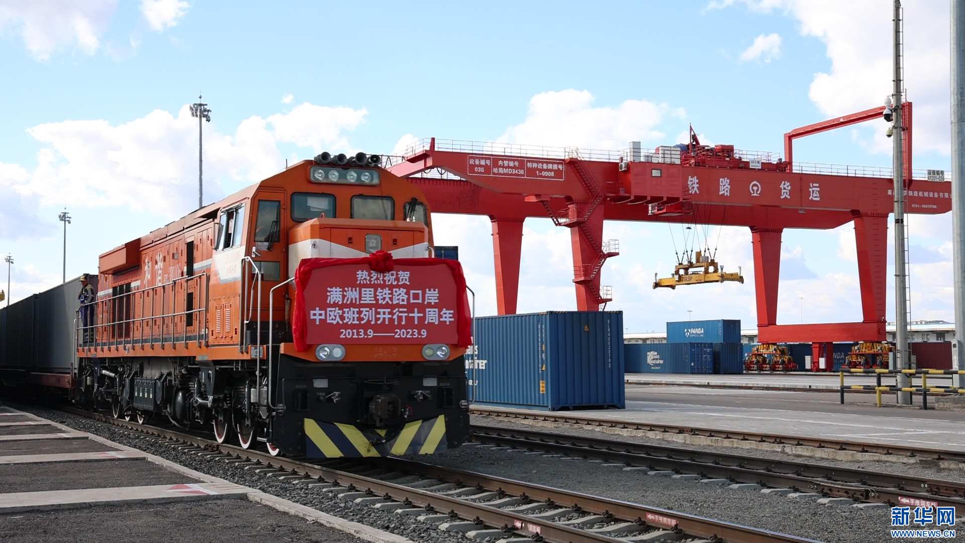 滿洲里鐵路口岸中歐班列開(kāi)行十周年等待發(fā)車(chē)。新華網(wǎng)發(fā) (李新軍 攝)