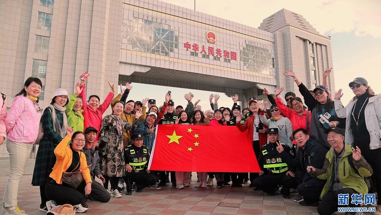 游客在滿洲里國(guó)門(mén)下合影。新華網(wǎng)發(fā) (李新軍 攝)