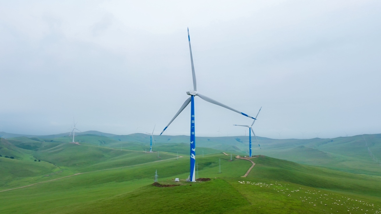 矗立在草原上的風(fēng)電機(jī)組。