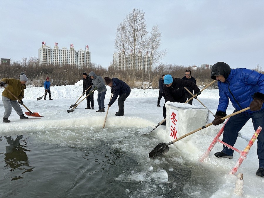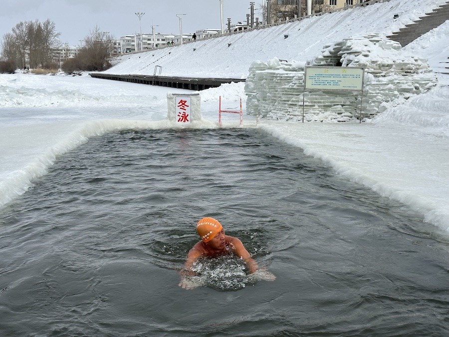 參加冬泳的協(xié)會成員只著泳衣,依次跳入在伊敏河冰面開鑿的冬泳池中,雖然天寒地凍,但是依然精神抖擻。