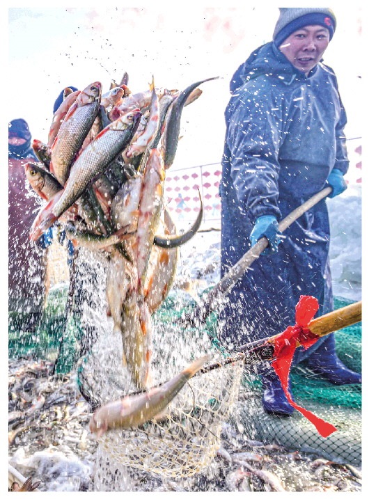 ▲1月13日,達里湖漁場的工作人員在撈魚裝箱。日前,內(nèi)蒙古達里湖冬捕旅游季在赤峰市克什克騰旗拉開帷幕。此次活動包括祭湖儀式、開湖捕魚、文藝展演等多個項目,吸引眾多游人前來觀看。新華社記者彭源攝