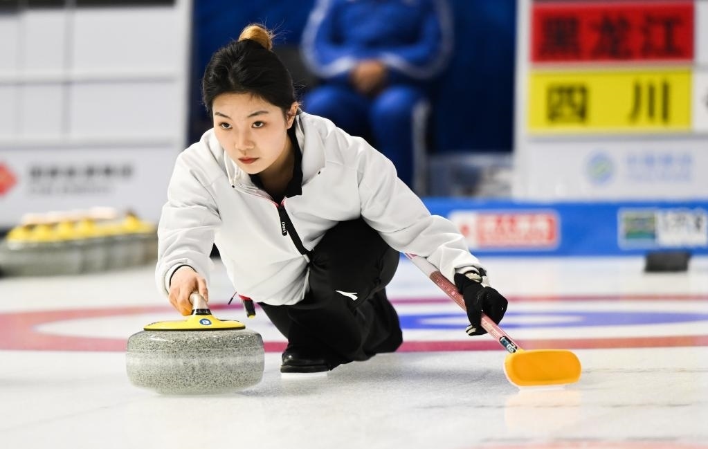 1月17日,四川隊(duì)選手崔欣然在第十四屆全國(guó)冬季運(yùn)動(dòng)會(huì)冰壺青年組比賽中擲壺。新華社記者 劉磊 攝