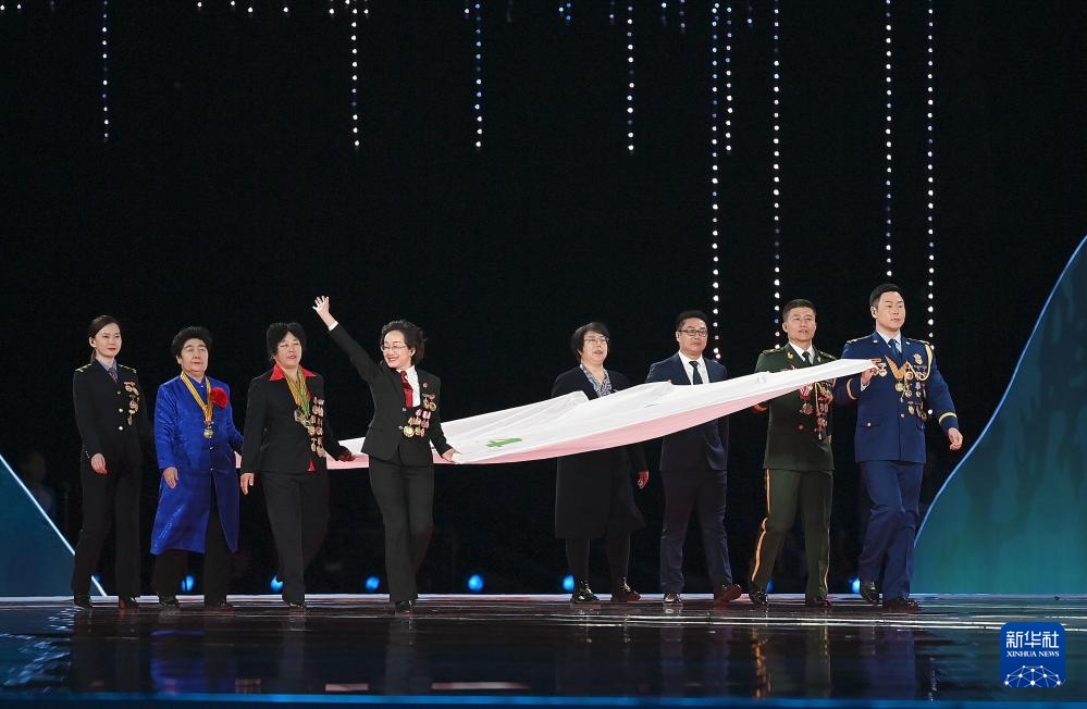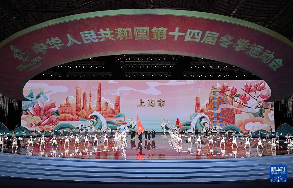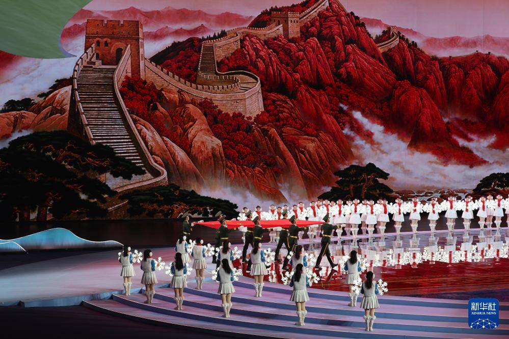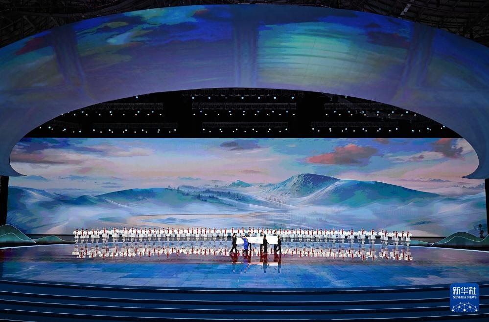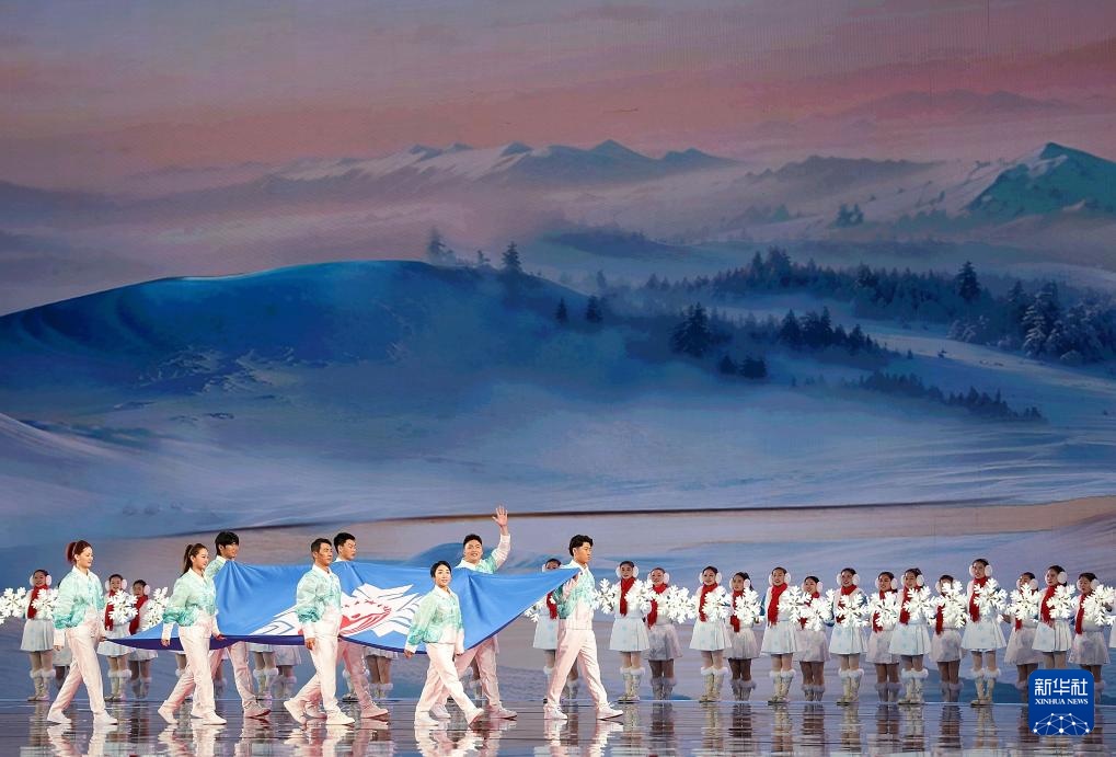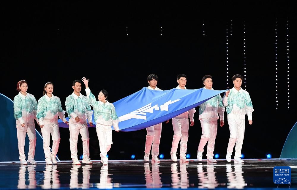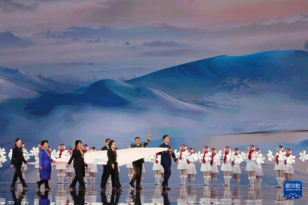??2月17日,中華人民共和國第十四屆冬季運動會會旗在開幕式上入場。新華社記者 楊晨光 攝