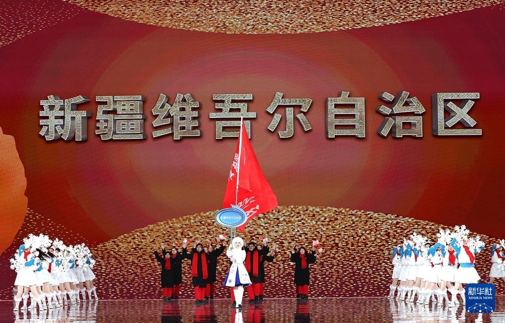 ??2月17日,新疆維吾爾自治區(qū)體育代表團在開幕式上入場。新華社記者 李博 攝