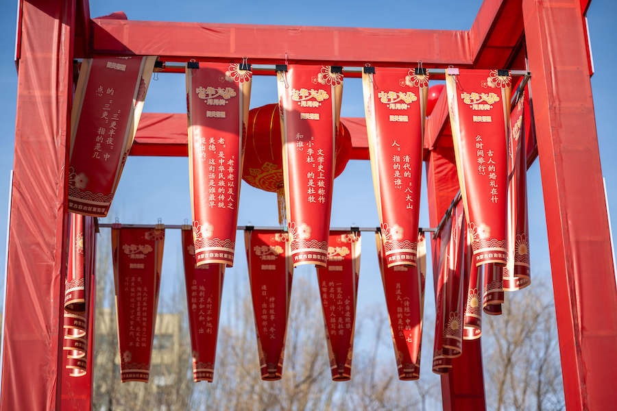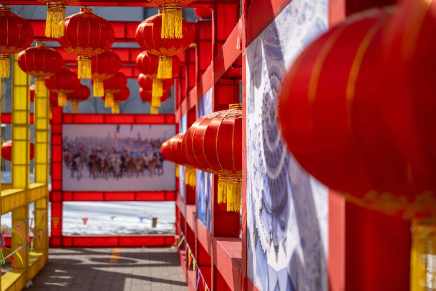 在內(nèi)蒙古展覽館的九曲陣中設(shè)有八個(gè)關(guān)口,每個(gè)關(guān)口懸掛著印有感黨恩、北疆文化、冰雪旅游、中華詩(shī)詞、傳統(tǒng)年俗等有關(guān)的知識(shí)問(wèn)答彩旗。
