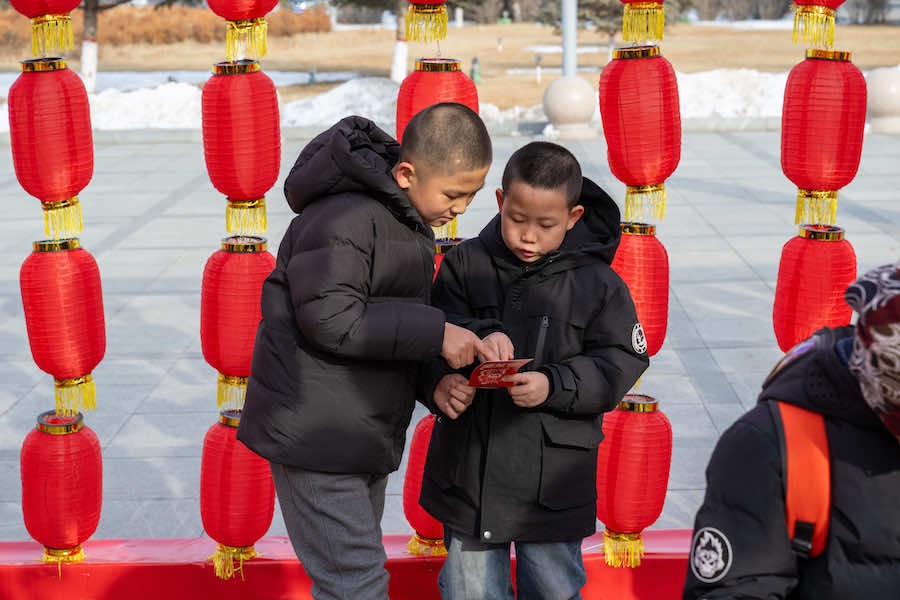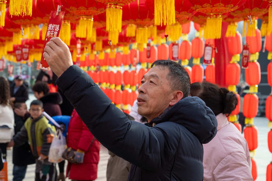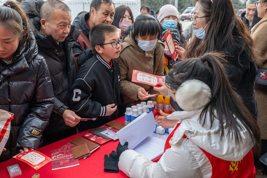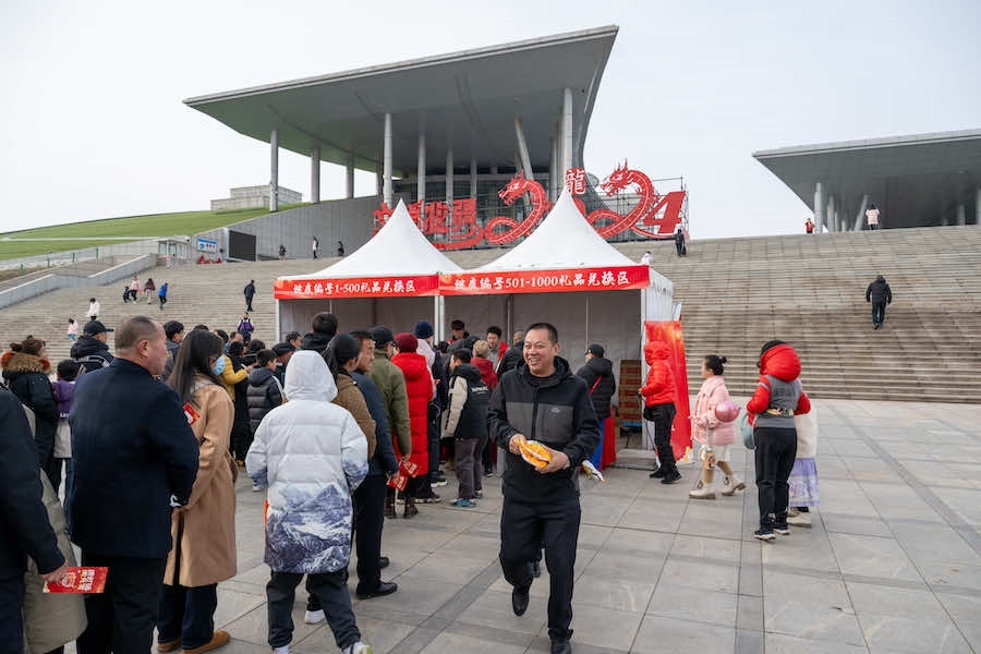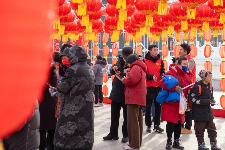 2月23日下午,在內(nèi)蒙古呼和浩特寶鼎廣場(chǎng),市民游客拿著燈謎卡來到禮品兌換區(qū),興奮不已地排隊(duì)等待著。