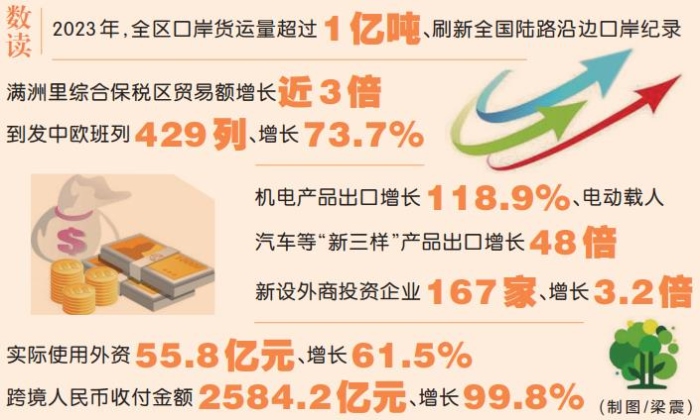 2023年,全區(qū)口岸貨運量超過1億噸、刷新全國陸路沿邊口岸紀錄;滿洲里綜合保稅區(qū)貿(mào)易額增長近3倍;到發(fā)中歐班列429列、增長73.7%;機電產(chǎn)品出口增長118.9%、電動載人汽車等“新三樣”產(chǎn)品出口增長48倍;新設外商投資企業(yè)167家、增長3.2倍;實際使用外資55.8億元、增長61.5%;跨境人民幣收付金額2584.2億元、增長99.8%……